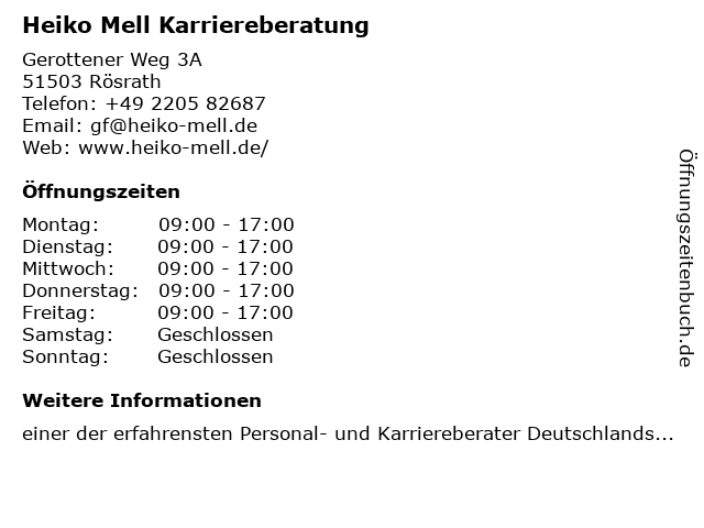 | Öffnungszeiten Heiko Mell Karriereberatung in Rösrath anzeigen | |