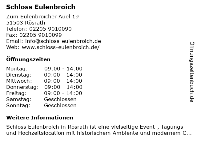 | Öffnungszeiten Schloss Eulenbroich in Rösrath anzeigen | |