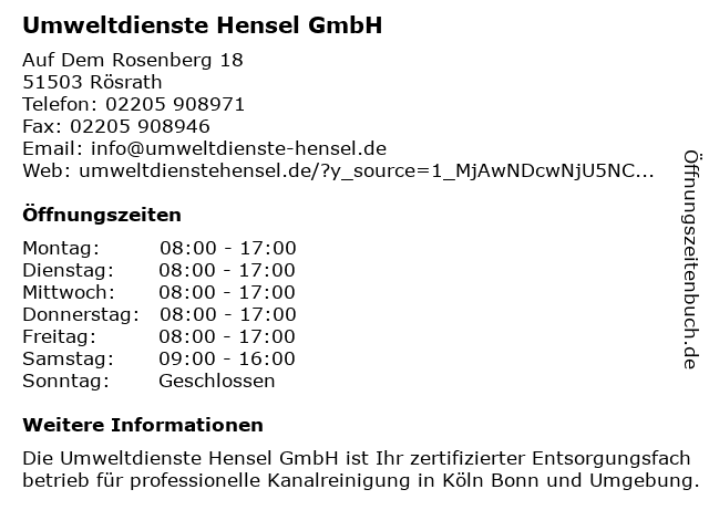 | Öffnungszeiten Umweltdienste Hensel GmbH in Rösrath anzeigen | |