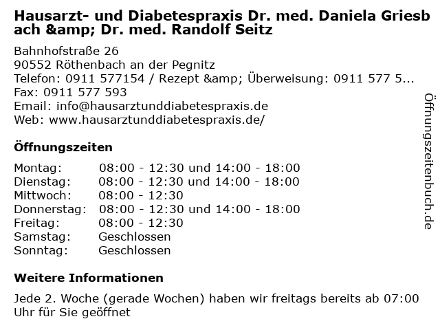 1 Hausarzt- und Diabetespraxis Röthenbach (Entfernung: 0,00 km) Bahnhofstraße 26, 90552 Röthenbach an der Pegnitz 6 SKK Manfred Seitz e.K., Kälte- und Klimatechnik (Entfernung: 7,51 km) Fischbacher Hauptstr. 125, 90475 Nürnberg |