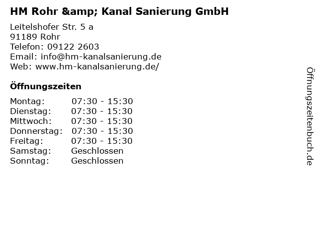 | Öffnungszeiten HM Rohr & Kanal Sanierung GmbH in Rohr anzeigen | |