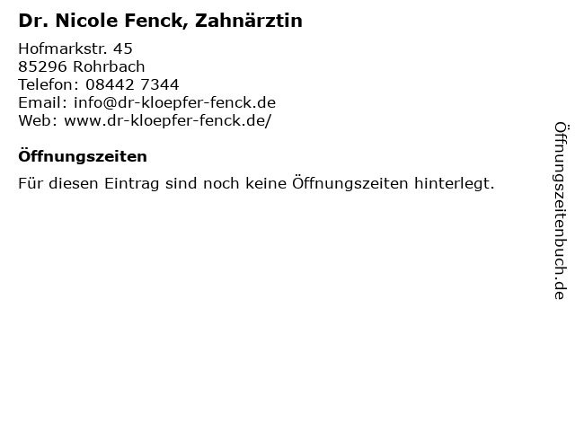 | Telefonnummer Dr. Nicole Fenck, Zahnärztin in Rohrbach (08442 7344) anrufen | |