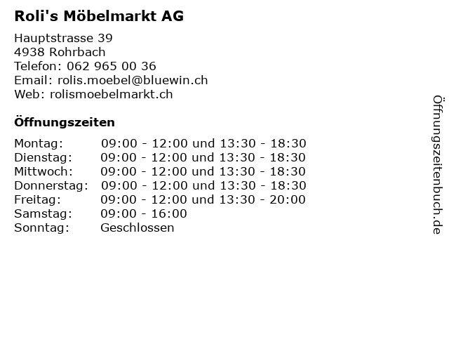| Öffnungszeiten Roli's Möbelmarkt AG in Rohrbach anzeigen | |