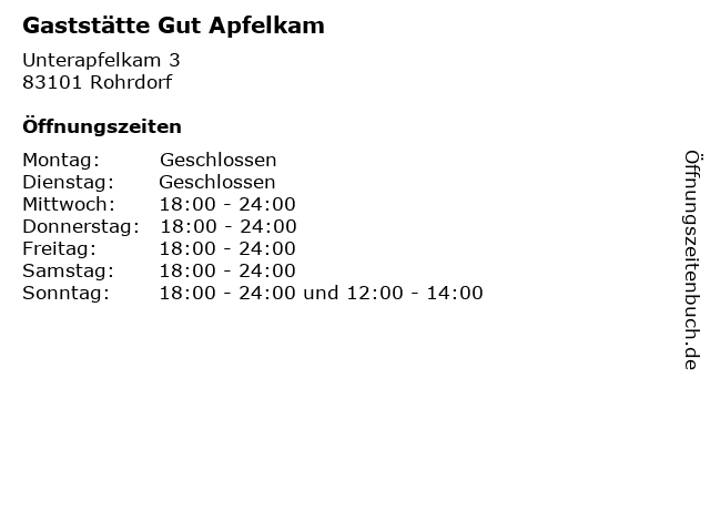 | Öffnungszeiten Gaststätte Gut Apfelkam in Rohrdorf anzeigen | |