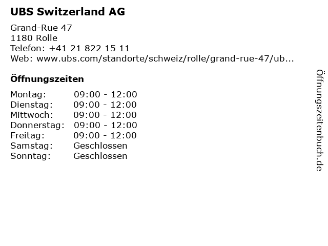 | Öffnungszeiten UBS Switzerland AG in Rolle anzeigen | |
