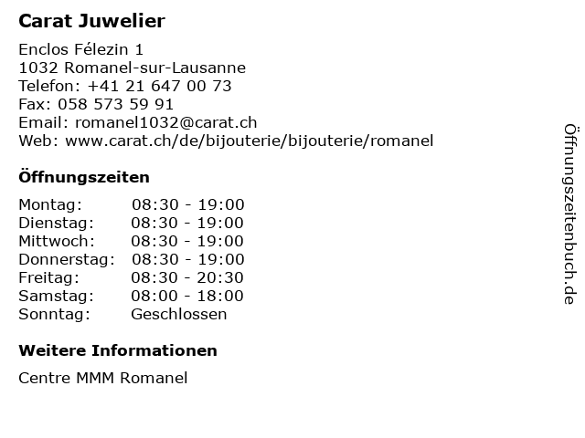 | Öffnungszeiten Carat Juwelier in Romanel-sur-Lausanne anzeigen | |