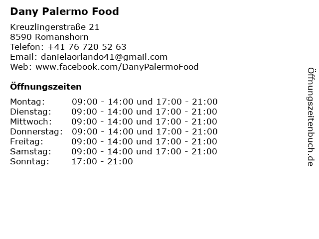 | Öffnungszeiten Dany Palermo Food in Romanshorn anzeigen | |