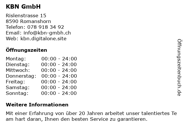 | Öffnungszeiten KBN GmbH in Romanshorn anzeigen | |
