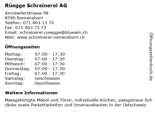 | Öffnungszeiten Rüegge Schreinerei AG in Romanshorn anzeigen | |
