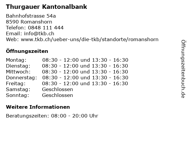| Öffnungszeiten Thurgauer Kantonalbank in Romanshorn anzeigen | |