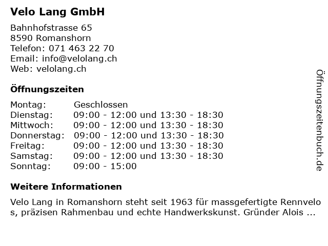 | Öffnungszeiten Velo Lang GmbH in Romanshorn anzeigen | |