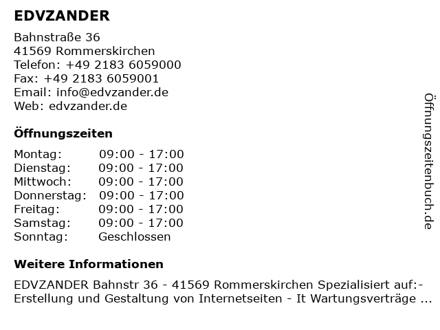 | Öffnungszeiten EDVZANDER in Rommerskirchen anzeigen | |