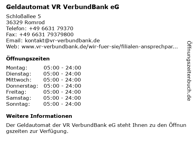 | Öffnungszeiten Geldautomat VR VerbundBank eG in Romrod anzeigen | |