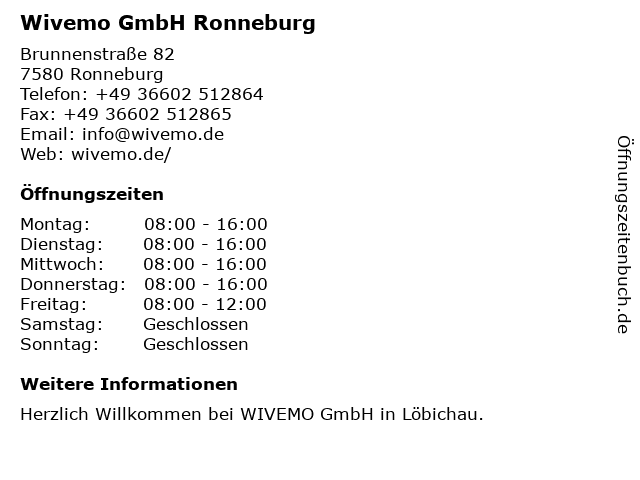 | Öffnungszeiten Wivemo GmbH Ronneburg in Ronneburg anzeigen | |