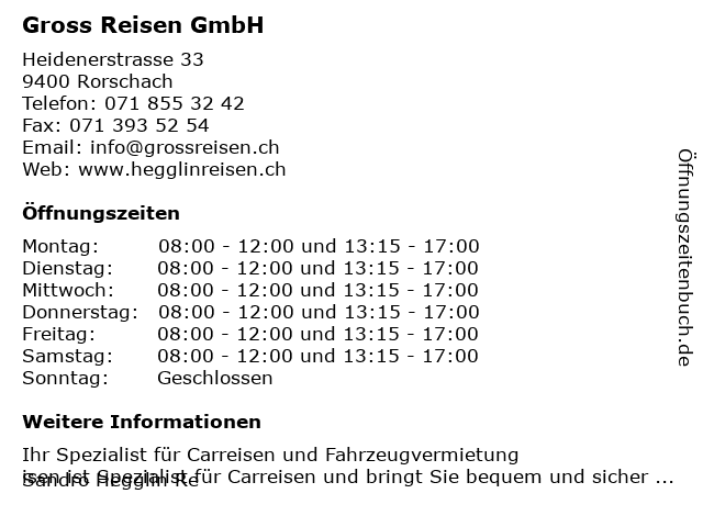 | Öffnungszeiten Gross Reisen GmbH in Rorschach anzeigen | |