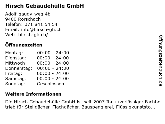 | Öffnungszeiten Hirsch Gebäudehülle GmbH in Rorschach anzeigen | |