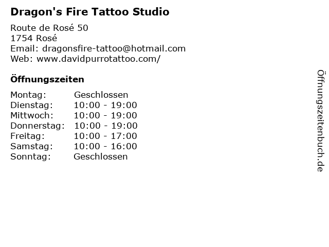 | Öffnungszeiten Dragon's Fire Tattoo Studio in Rosé anzeigen | |