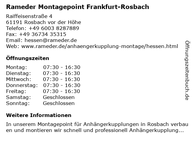 Branchen & Suchbegriffe zu Rameder Montagepoint Frankfurt-Rosbach:anhängerkupplung, dachbox, dachträger, einbau, elektrosatz, fahrradträger, gepäckbox, montage, montagepoint, rameder, rosbach vor der höhe, werkstatt |