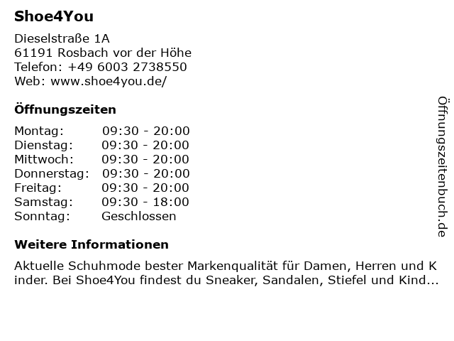 Öffnungszeiten Shoe4You in Rosbach vor der Höhe anzeigen | |