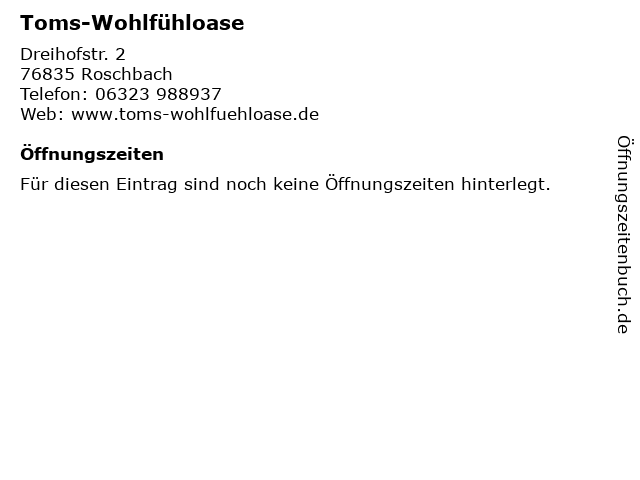| Telefonnummer Toms-Wohlfühloase in Roschbach (06323 988937) anrufen | |