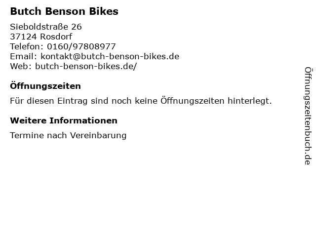 | Öffnungszeiten Butch Benson Bikes in Rosdorf anzeigen | |