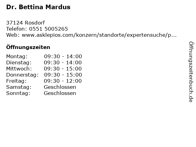 | Öffnungszeiten Dr. Bettina Mardus in Rosdorf anzeigen | |