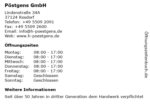 | Öffnungszeiten Pöstgens GmbH in Rosdorf anzeigen | |