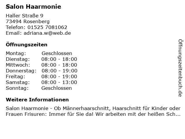 | Öffnungszeiten Salon Haarmonie in Rosenberg anzeigen | |