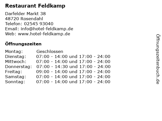| Öffnungszeiten Restaurant Feldkamp in Rosendahl anzeigen | |