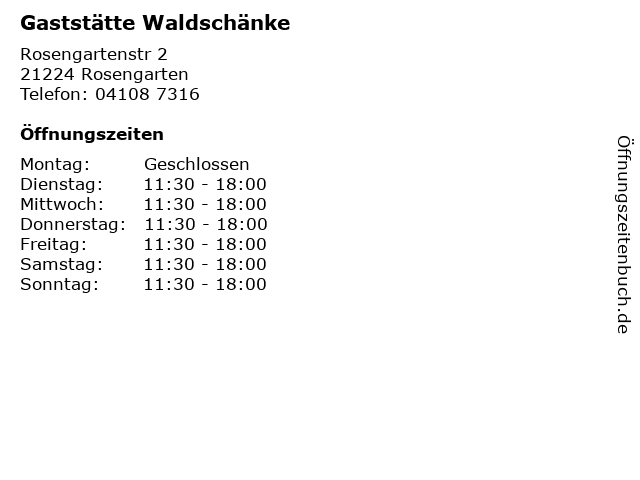 | Öffnungszeiten Gaststätte Waldschänke in Rosengarten anzeigen | |