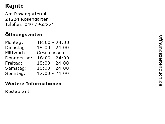 | Öffnungszeiten Kajüte in Rosengarten anzeigen | |