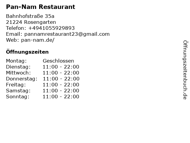 | Öffnungszeiten Pan-Nam Restaurant in Rosengarten anzeigen | |