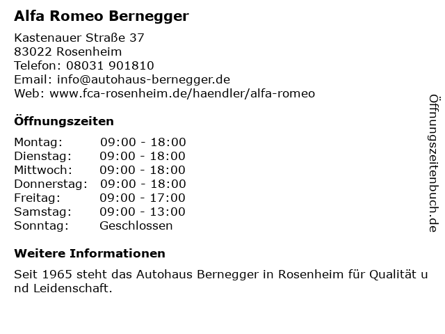 | Öffnungszeiten Alfa Romeo Bernegger in Rosenheim anzeigen | |