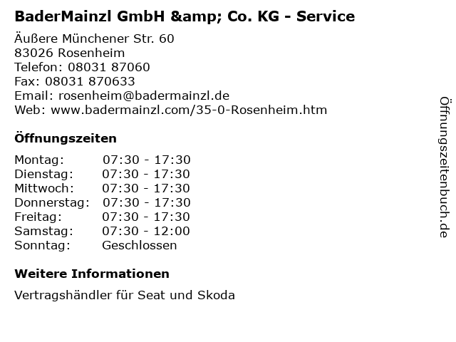 2 BaderMainzl GmbH & Co. KG - Service (Entfernung: 10,35 km) Münchener Straße 2 a, 83052 Bruckmühl-Heufeld 4 BaderMainzl GmbH & Co. KG - Verkauf (Entfernung: 0,95 km) Äußere Münchener Straße 60, 83026 Rosenheim 5 BaderMainzl GmbH & Co. KG - Werkstatt (Entfernung: 0,95 km) Äußere Münchener Straße 60, 83026 Rosenheim 6 |