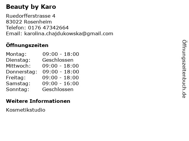 | Öffnungszeiten Beauty by Karo in Rosenheim anzeigen | |