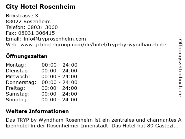 | Öffnungszeiten City Hotel Rosenheim in Rosenheim anzeigen | |