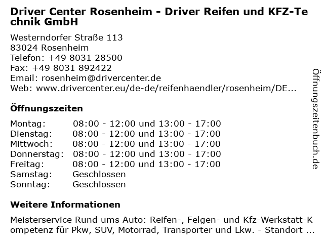 Branchen & Suchbegriffe zu Driver Center Rosenheim - Driver Reifen und KFZ-Technik GmbH:auto-service, center, driver, fahrzeugservice, hauptuntersuchung (tüv / dekra), inspektion, kfz, kfz-werkstatt, lkw reifen, pkw-reifen, reifen, reifenhändler rosenheim, reifenwechsel rosenheim, stapler reifen, technik |