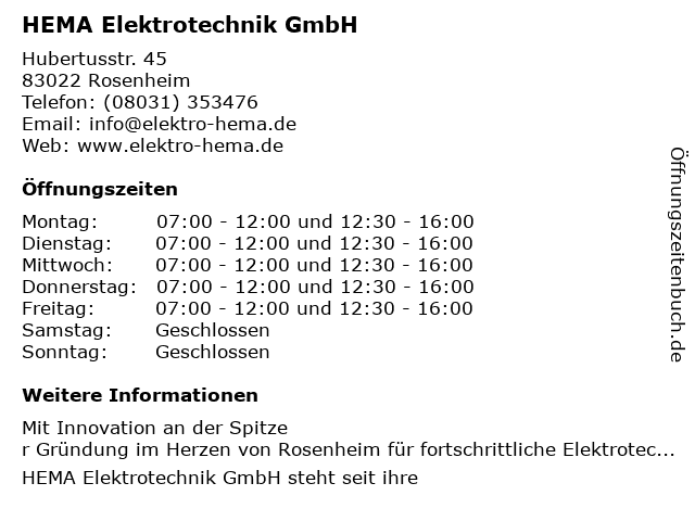 | Öffnungszeiten HEMA Elektrotechnik GmbH in Rosenheim anzeigen | |