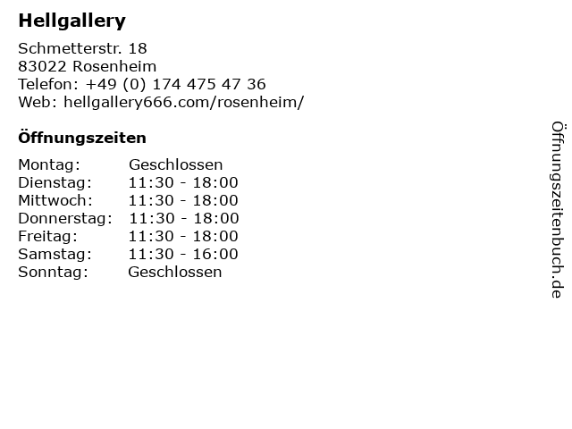 | Öffnungszeiten Hellgallery in Rosenheim anzeigen | |