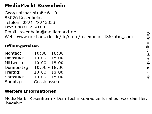 | Öffnungszeiten MediaMarkt Rosenheim in Rosenheim anzeigen | |