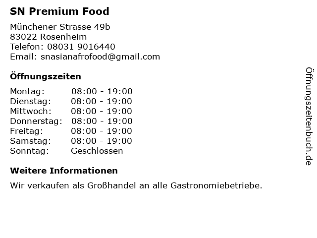 | Öffnungszeiten SN Premium Food in Rosenheim anzeigen | |