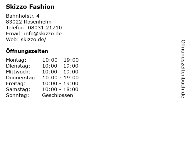 | Öffnungszeiten Skizzo Fashion in Rosenheim anzeigen | |