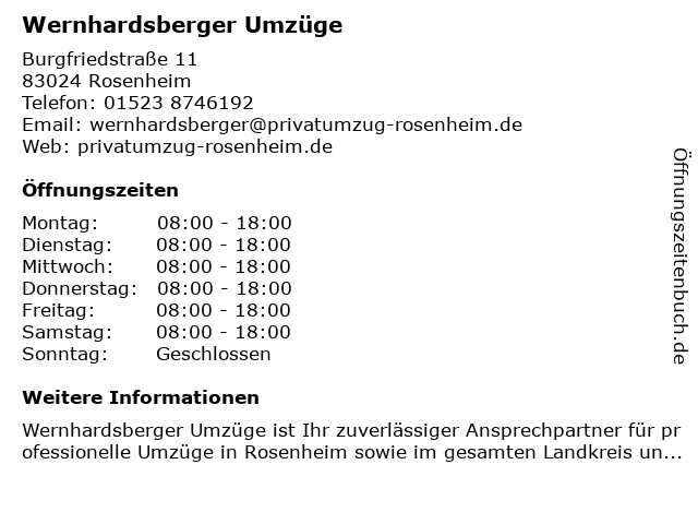 | Öffnungszeiten Wernhardsberger Umzüge in Rosenheim anzeigen | |