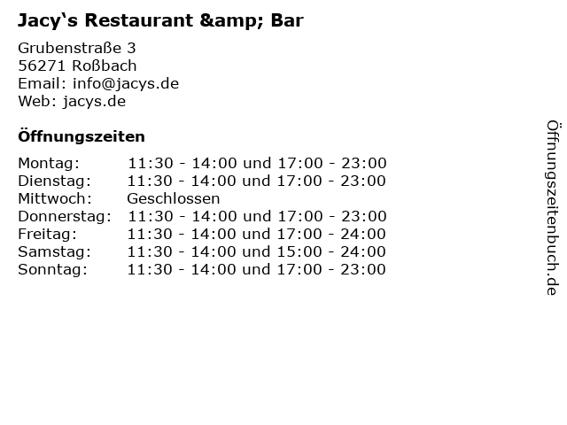 | Öffnungszeiten Jacy‘s Restaurant & Bar in Roßbach anzeigen | |