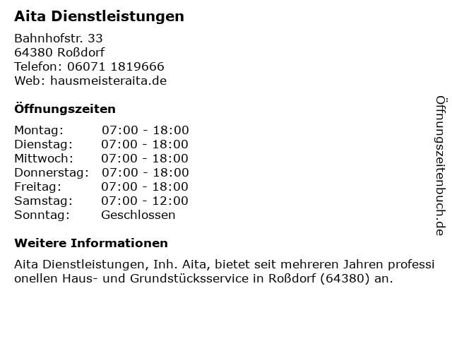 | Öffnungszeiten Aita Dienstleistungen in Roßdorf anzeigen | |