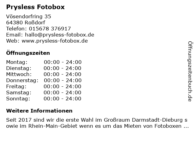 | Öffnungszeiten Prysless Fotobox in Roßdorf anzeigen | |