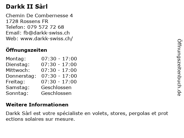| Öffnungszeiten Darkk II Sàrl in Rossens FR anzeigen | |