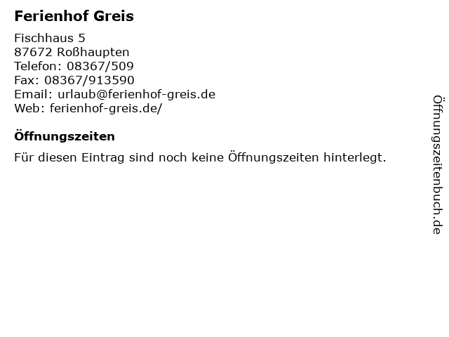 | Öffnungszeiten Ferienhof Greis in Roßhaupten anzeigen | |