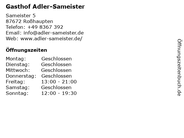 | Öffnungszeiten Gasthof Adler-Sameister in Roßhaupten anzeigen | |