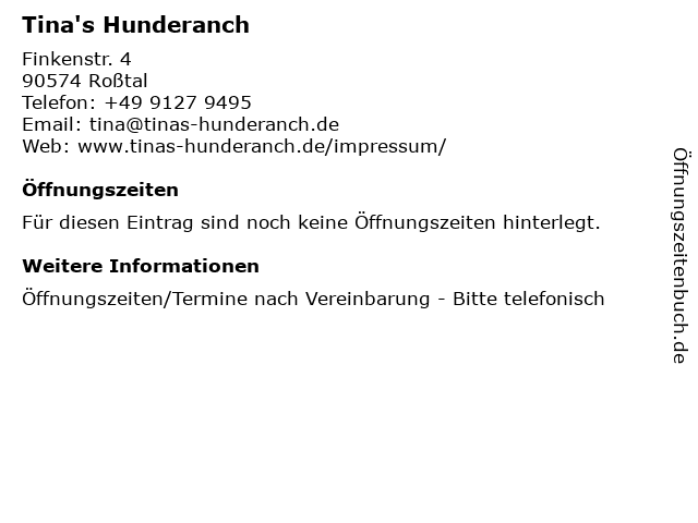 | Öffnungszeiten Tina's Hunderanch in Roßtal anzeigen | |